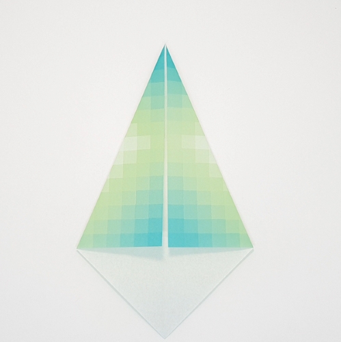Start with the white side of the paper facing up. Turn the paper 45 degrees clockwise. Fold in half and unfold.