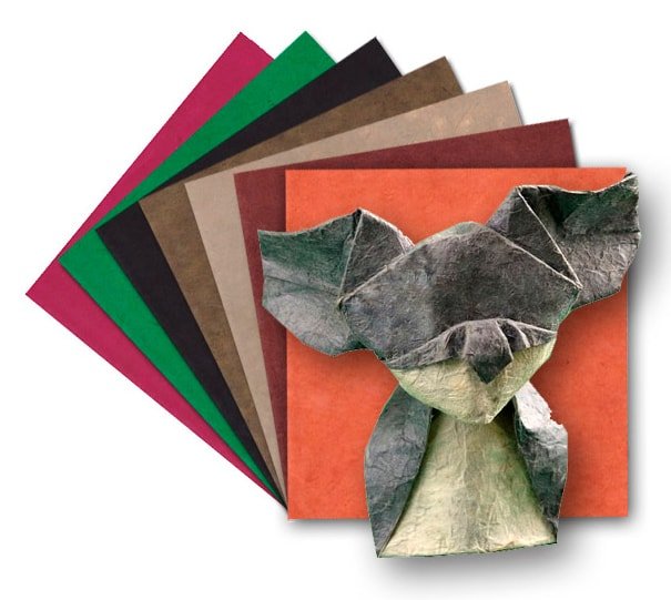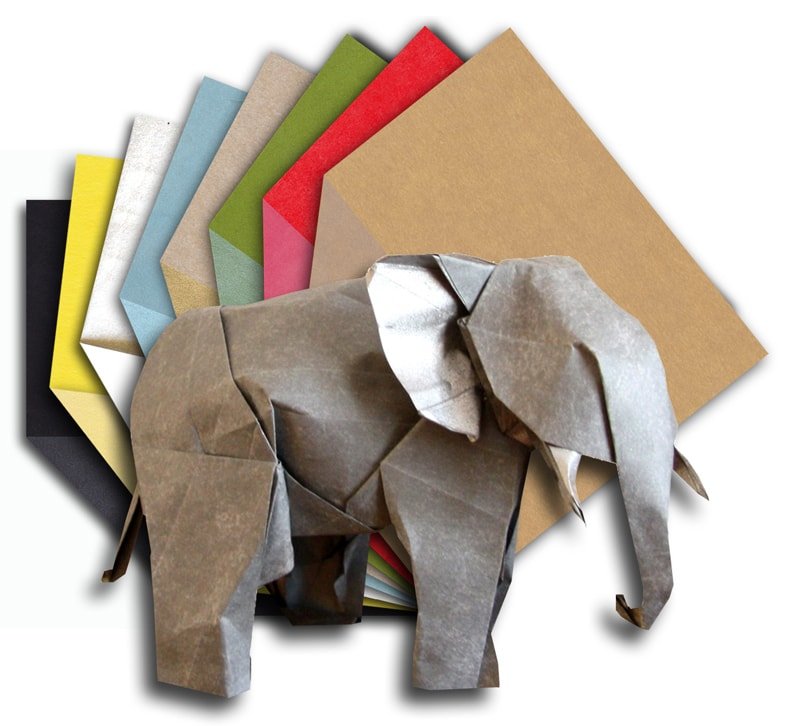 Elephant Hide paper is very interesting. It’s a specially made paper from a company called Zanders in Germany, and its manufacturing process is a secret. Many origami artists would argue that this is one of the best origami papers there is. Elephant Hide is officially described as “A rugged bookbinding paper with a parchment grain.” This paper also has an FSC Certification from the Forest Stewardship Council, which means the paper comes from responsibly managed forests, and you can feel good about using it. This is definitely one of the thickest origami papers and comes in 110 GSM and 190 GSM weights.